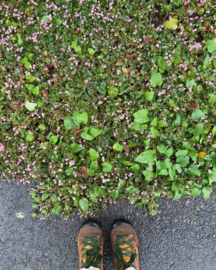 「まるでギャラリーのような空間に並ぶお洋服を眺めて、デザイナーさんの本を買って帰りました。やっぱりすごい可愛かった。うっとりした気持ちでお店を出て、2、3歩歩いたところにちっちゃい可愛い花が咲いてたんですよ。それを見た瞬間に『わー、これ刺繍にしたい』と思ったんです。」