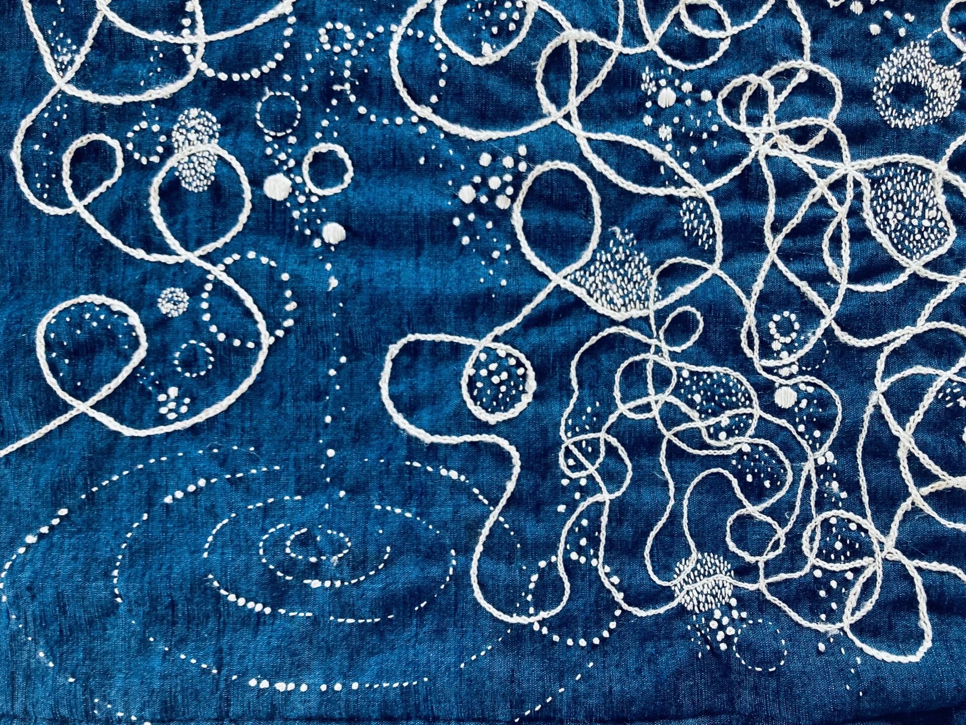 「ある時『もうこの気持ちを叫びたい、うおーって言いたい』となったんです。モヤモヤしていることを布の上に全部出そうと思って。言葉にならない気持ちだから鉛筆でグルグル落書きするみたいに、ひたすら糸をこうチクチクチクチクやっていったのね。自分で見てもこれはなんだろうみたいな、これはどう着地するんだろうというものを何日も何日もやっているうちに1ヶ月くらい経って。それでも続けていたら2ヶ月くらいでやっと形になって、自分で悪くないなって思えたんですよ。」