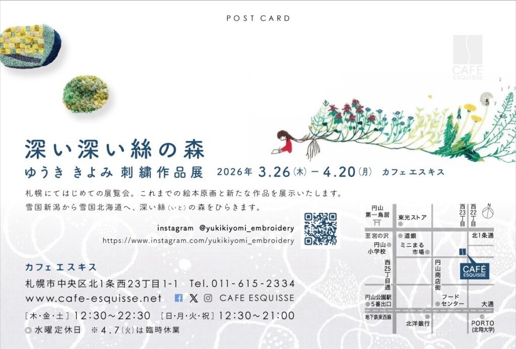 これまでの絵本原画と新たな作品を展示いたします。雪国から雪国へ、深い絲の森をひらきます。(展示案内文より)